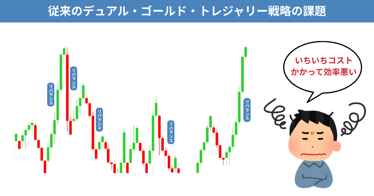 デュアル・ゴールド・トレジャリー戦略には、売買時にリバランスコストがかかり、実現が難しい課題がありました。